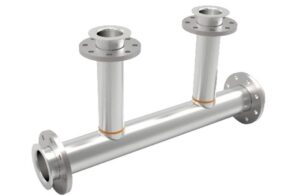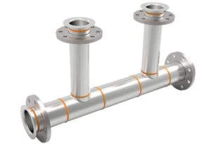 The traditional method may require ten welded joints to manufacture: five pipes, four flanges (discs) and two T-fittings to be assembled.